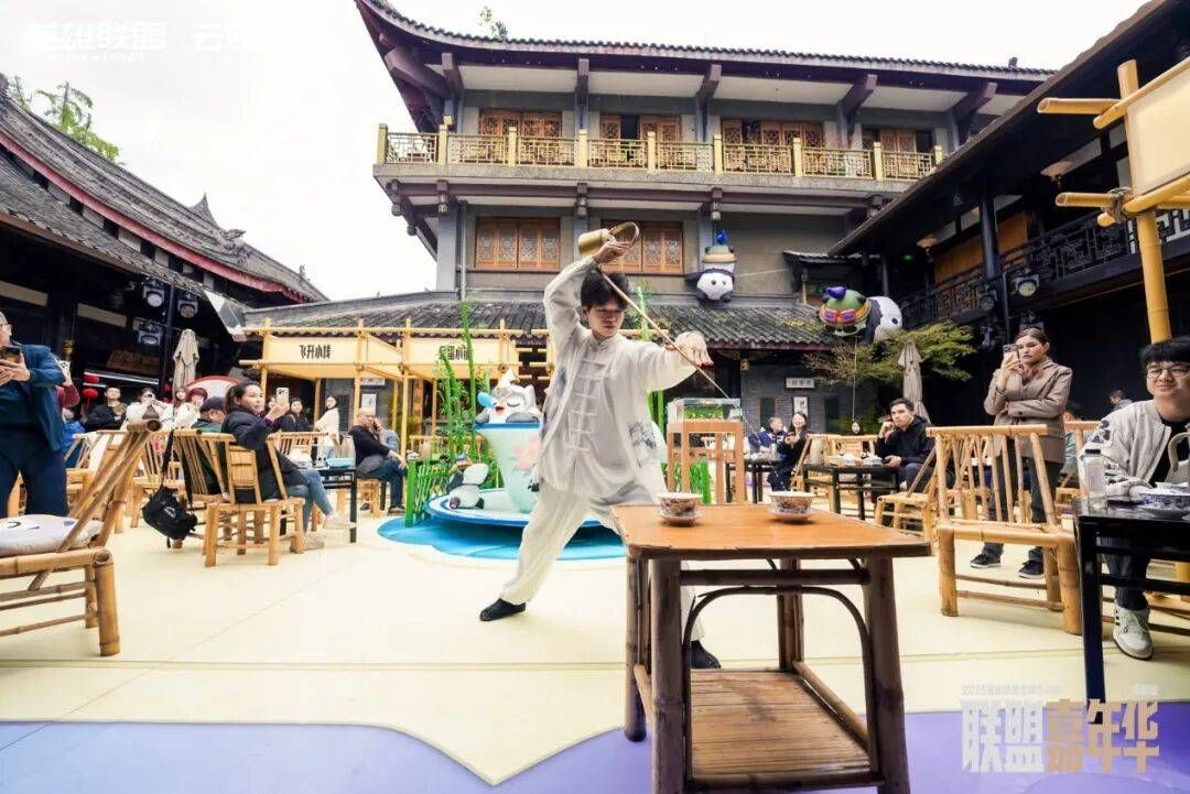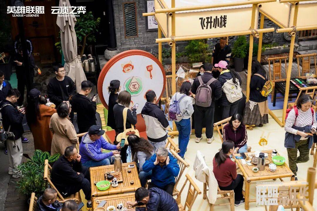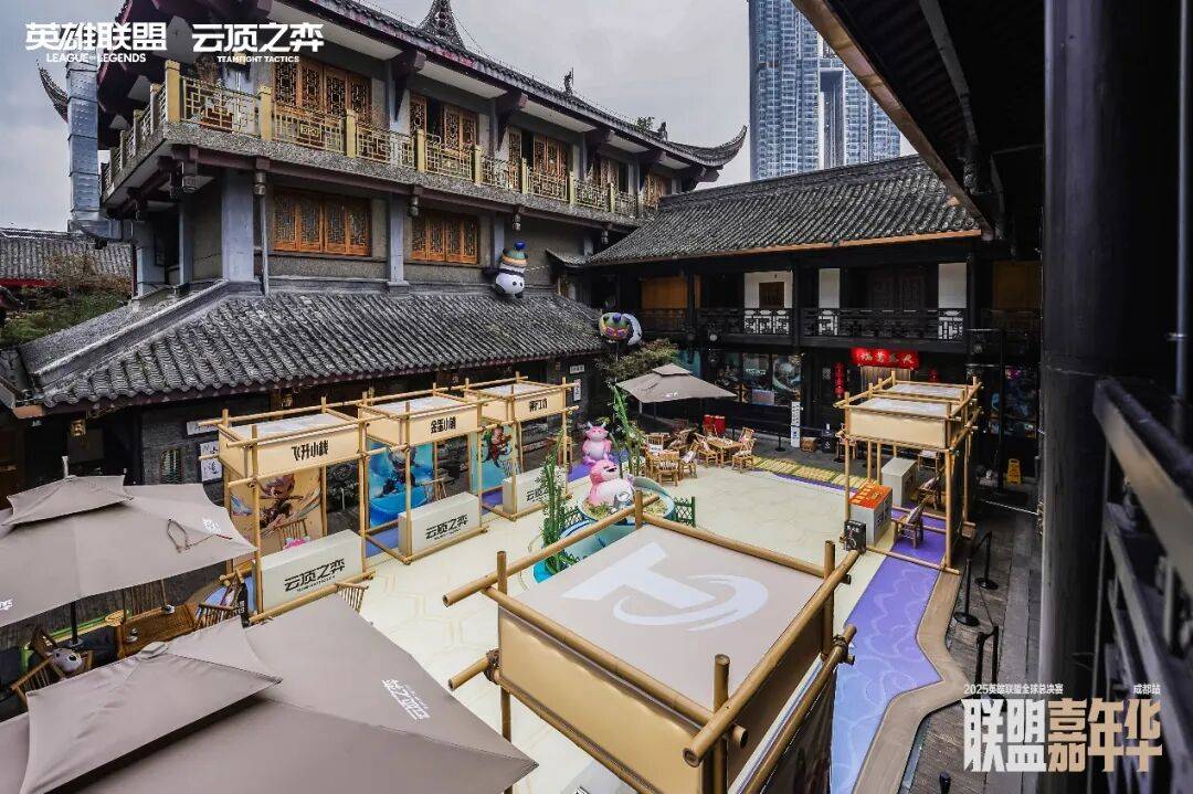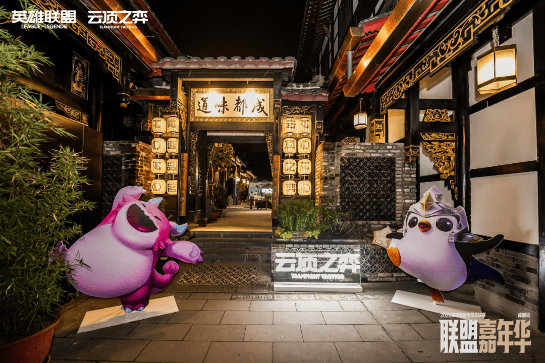 不过让我印象最深的,除了“主舞台”的热闹,还有太古里旁边一处看起来有些“反差”的小天地:《英雄联盟:云顶之弈》在春熙路上的一家老茶馆里搭建了一座“胖达巴适茶楼”——对,云顶之弈真的做了个既能喝茶又能“下棋”的地方。