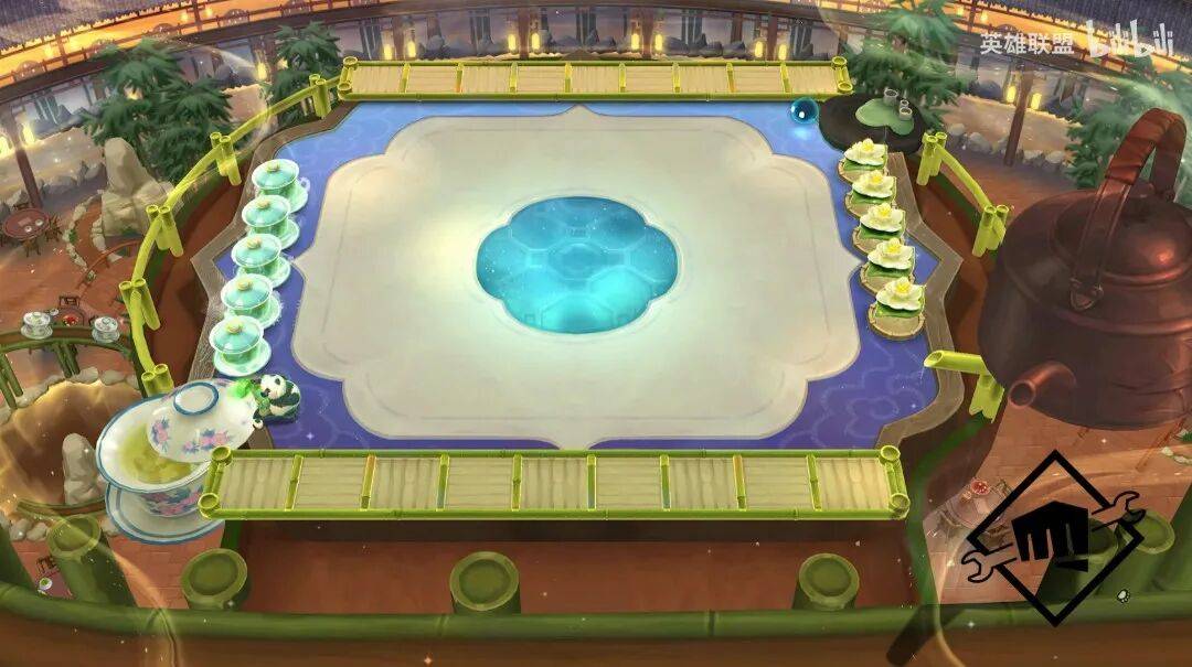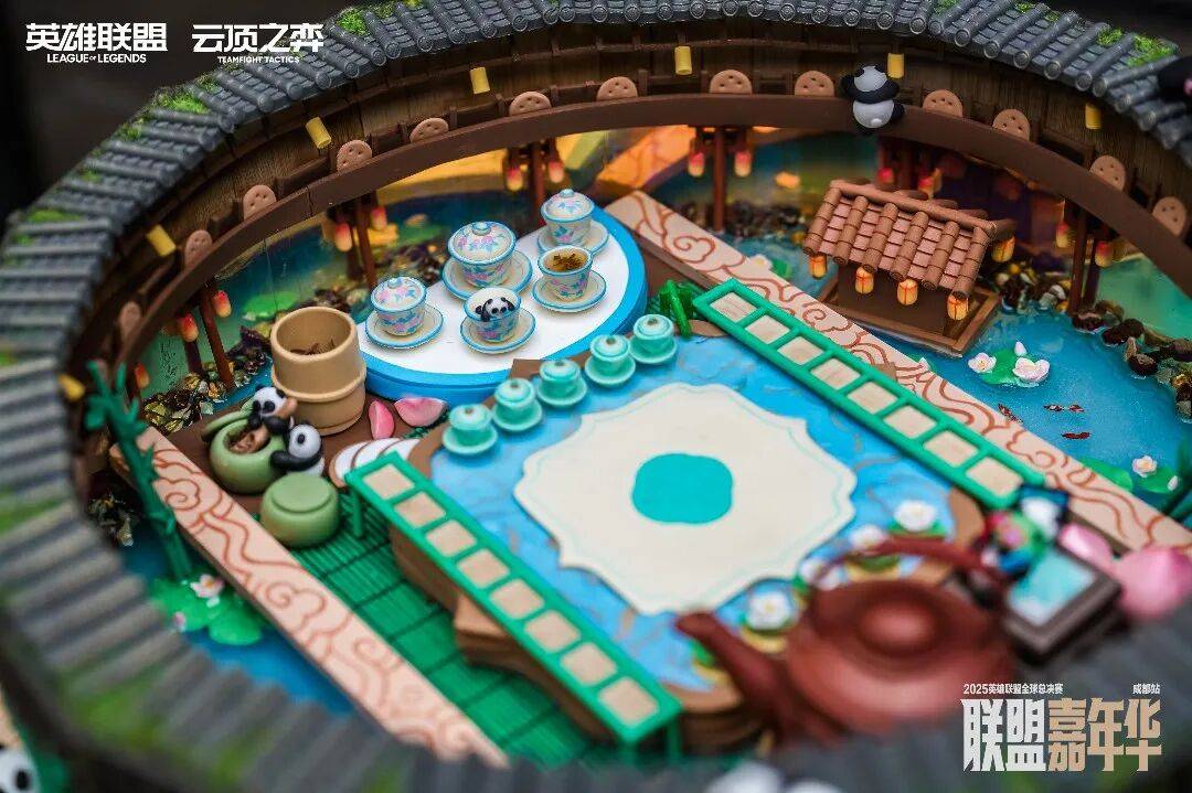 没错,中间的造景,就是参考这次云顶之弈世界赛版本更新的胖达巴适茶楼棋盘元素搭建的。原本只是游戏里的新棋盘和熊猫、茶碗这些设计,这次都实打实地做成了现场造景。