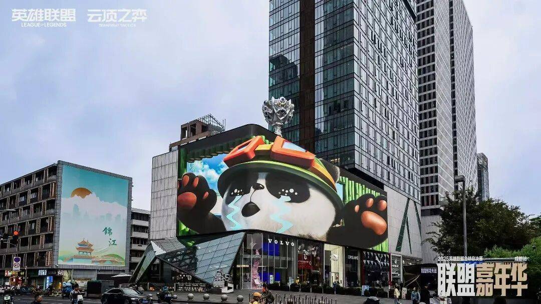 今年的嘉年华覆盖了春熙路、太古里等五大商业体,从IFS楼上那只巨大的熊猫旁往下望去,整个春熙路像被联盟元素刷了一层新皮肤。