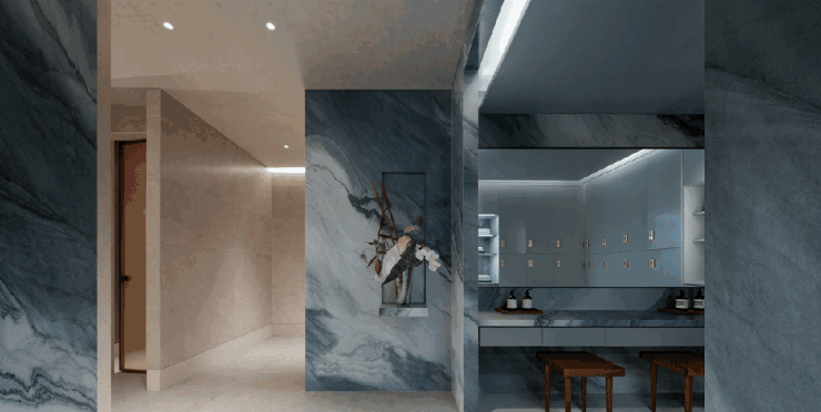 就连车库也充满艺术巧思,艺术橱窗式主题景墙搭配自行车修理区,让归家动线充满仪式感。