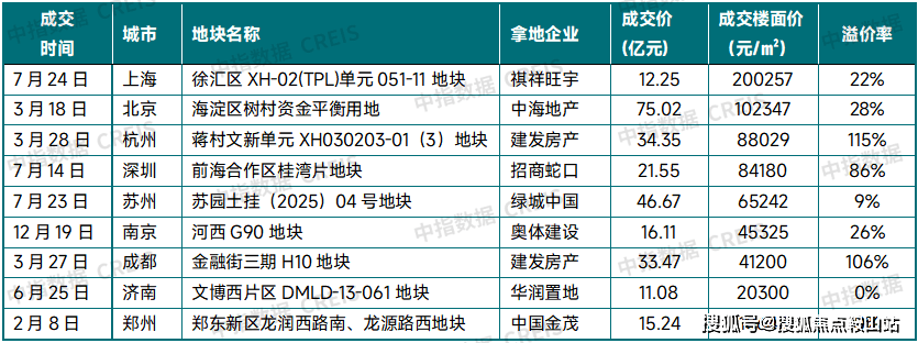 2025年一季度,北京、成都两度刷新地价纪录,杭州三次刷新单价纪录,其中北京海淀树村地块成交楼面价102347元/㎡,刷新北京地价单价最高纪录(之前最高纪录为1月2日建发竞得的海淀朱房地块,成交楼面价95407元/㎡);成都金融城三期H10地块经213轮竞价被建发以高溢价率106%获取,成交楼面价达41200元/㎡;杭州西湖蒋村文新单元XH030203-01(3)地块成交楼面价88029元/㎡,溢价率115.39%。三季度,上海、深圳、苏州宅地单价纪录相继刷新,其中上海徐汇地块成交楼面价达20.03万元/m²,刷新全国宅地地价最高纪录,但该地块位于核心地段,体量较小,规划建面仅6117平方米;深圳前海桂湾T201-0232地块吸引12家房企参拍,成交楼面价84180元/㎡,溢价率达86.1%,刷新深圳宅地地价最高纪录。
