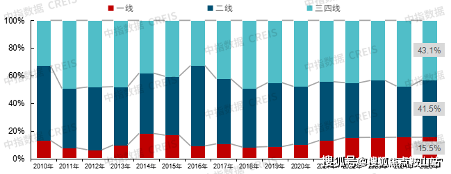 根据中指数据,2025年,一二线年均有提升,合计占比达57.0%,较2024年提升4.4个百分点。其中,一线年持平;二线个百分点;三四线个百分点。