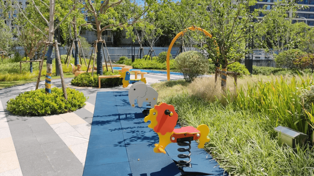 游乐区域周围植被环绕,有假山瀑布、草坪花坛,让孩子们仿佛置身于大自然中畅玩嬉戏。