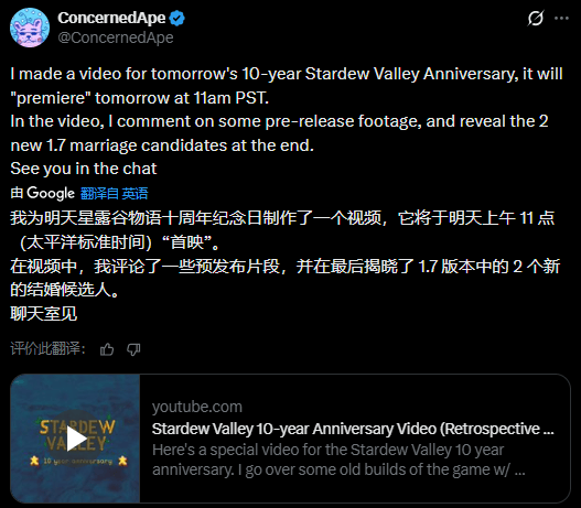 游戏开发者ConcernedApe亲自制作的十周年纪念视频将于2月27日凌晨3点公布。