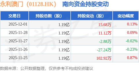 证券之星消息,12月1日南向资金增持15.68万股永利澳门(01128.HK)。近5个交易日中,获南向资金增持的有3天,累计净增持99.6万股。近20个交易日中,获南向资金减持的有11天,累计净减持408.16万股。截至目前,南向资金持有永利澳门(01128.HK)1.19亿股,占公司已发行普通股的2.27%。